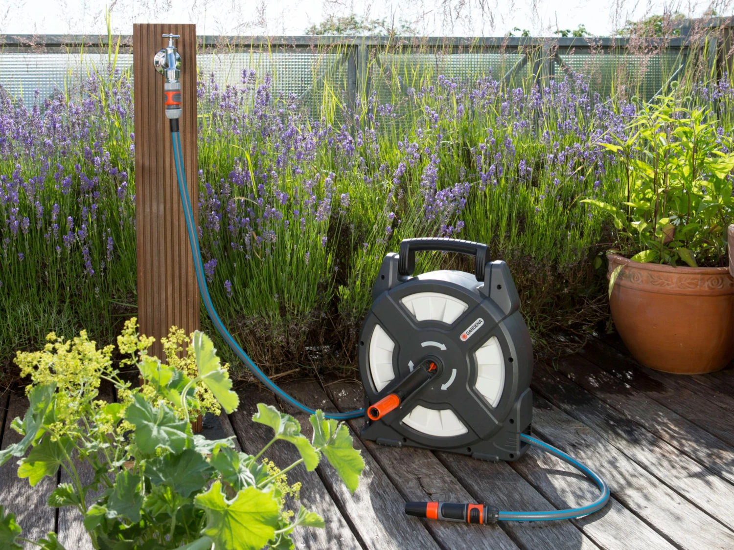 The Gardena Terrace Hose Box can be neatly stored and is easy to transport.